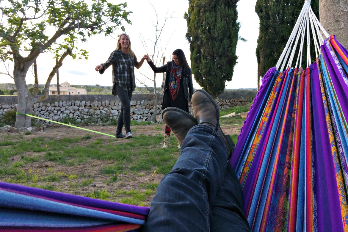 Aus den Boxen tönt wunderbar chillige Musik und wir setzen uns erst mal an den Pool und trinken einen Kaffee mit Sojamilch. Zwischen zwei Feigenbäumen hängt eine lila Hängematte und ruft leise nach mir. Ich lasse mich hineinsinken, während meine Freundinnen versuchen auf der Slackline ein paar Schritte zu machen. Was allerdings aufgrund der schlimmen Lachkrämpfe kaum von Erfolg gekrönt ist.
